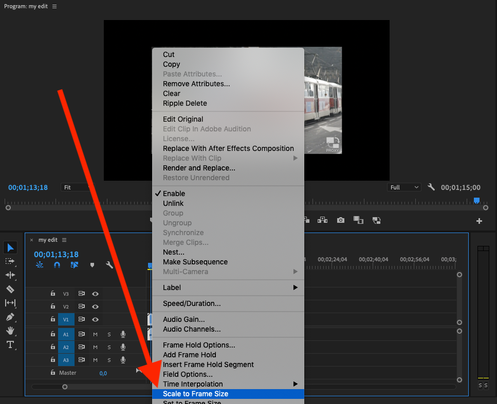- シーケンス プレビューでクリップの周囲に黒いフレームが表示されている場合は、シーケンス内のクリップを右クリックして、[フレーム サイズに合わせて拡大縮小] をクリックします。シーケンスにドラッグ アンド ドロップするすべてのアセットに対してこの手順を繰り返す必要があります。または、複数のシーケンス アセットを一度に選択して、それらすべてに対して同時に拡大縮小を実行することもできます。