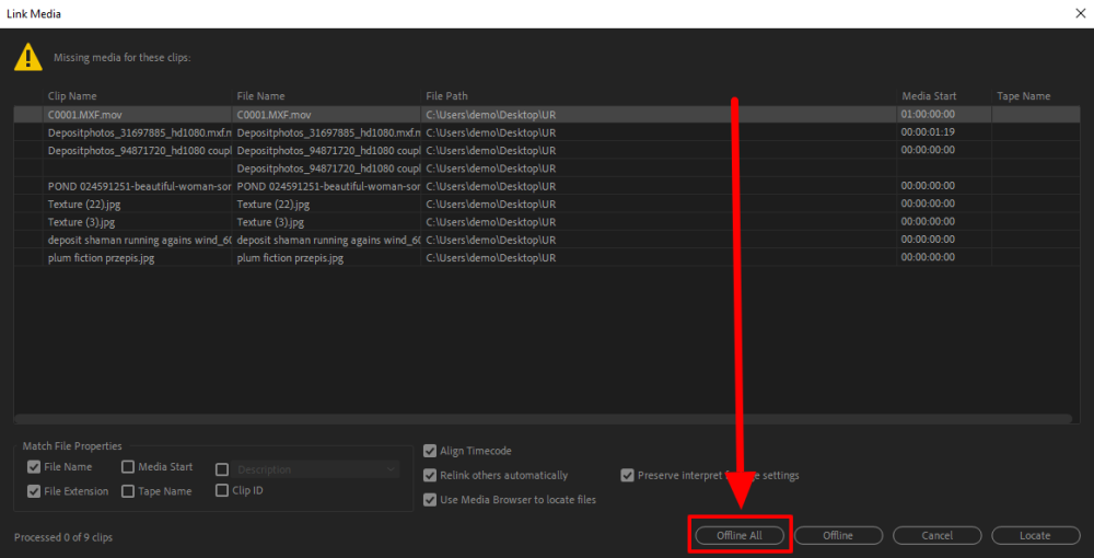 5. Premiereが起動すると、プロジェクト内のすべてのメディアが見つからないというメッセージが表示されます。編集プロキシがこのプロジェクトに存在しないため、これは正常です。また、それらはコンフォームプロセスに必要ありません。