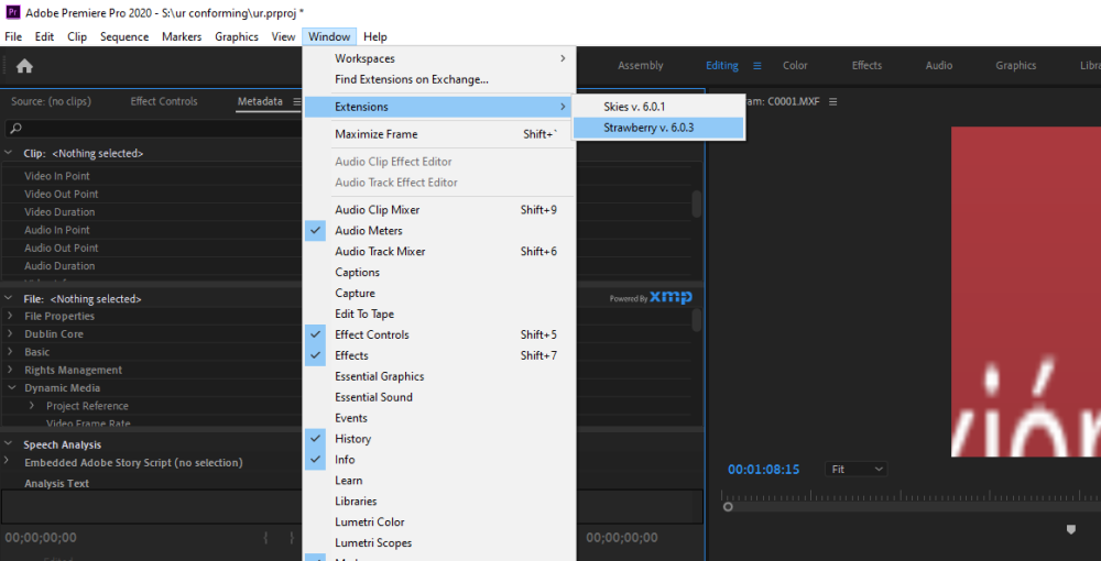 7. Premiereで「ウィンドウ→拡張機能」に移動し、Strawberryパネル拡張機能をクリックします。