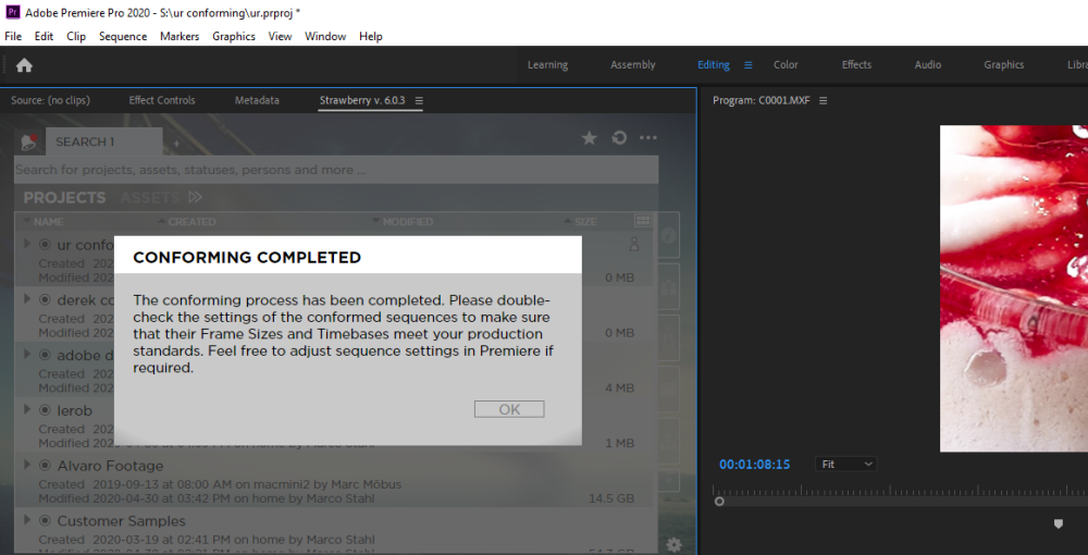 9. コンフォームプロセスが完了すると、コンフォームしたシーケンスの Premiere シーケンス設定を確認するように通知されます。「OK」を押して続行します。