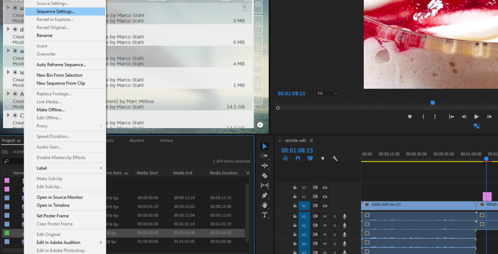 10. コンフォームしたシーケンスの1つを右クリックし、コンテキストメニューから「シーケンス設定」を選択します。