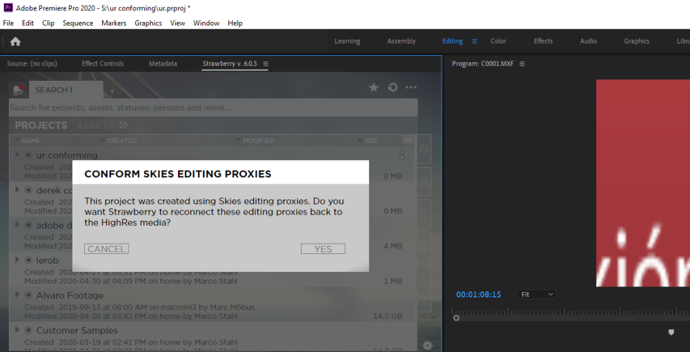8. パネルが起動するとすぐに、開いているプロジェクトが編集プロキシに基づいて作成された「リモート編集プロジェクト」であることが通知されます。オフライン編集プロキシを元の高解像度メディア ファイルに再リンクするかどうかを尋ねられます。コンフォームプロセスを開始するには「はい」をクリックし、中止するには「キャンセル」をクリックします。