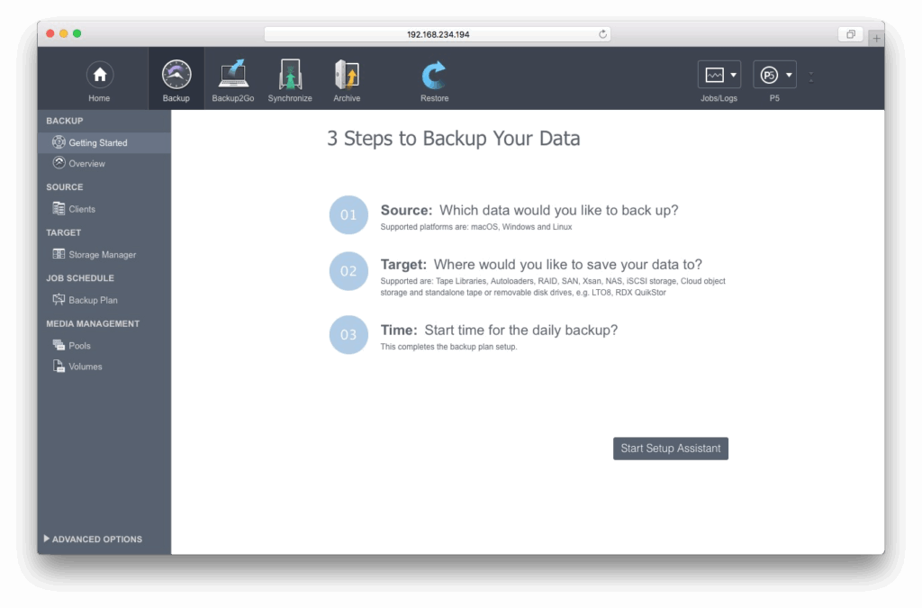 バックアップ アシスタントは、保存する内容とタイム スケジュールの情報を保持するバックアップ プラン (セクション6.6 「バックアッププラン」を参照) を定義します。さらに、仮想または物理メディア チェンジャーまたは単一ドライブが自動的に構成され、ディスク バックアップまたはテープ バックアップ タイプのメディア プールが作成されるため、ボリュームへの書き込みに備えてボリュームにラベルを付けることができます。ターゲット ストレージの詳細については、セクション6.2~6.3を参照してください。