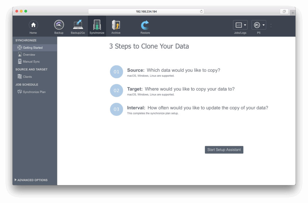 このセクションでは、いくつかの手順でバックアップ、アーカイブ、またはシンクロナイズを設定する方法を説明します。セットアップの詳細な説明は、マニュアルのセクション 6 ~ 11 に記載されています。
