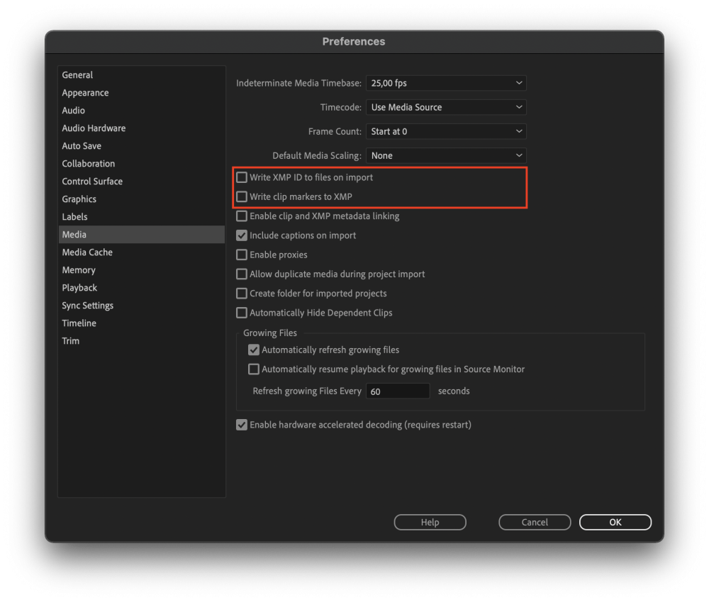 2. 「インポート時にXMP IDをファイルに書き込む」と「クリップマーカーをXMPに書き込む」のチェックが外れていることを確認します。