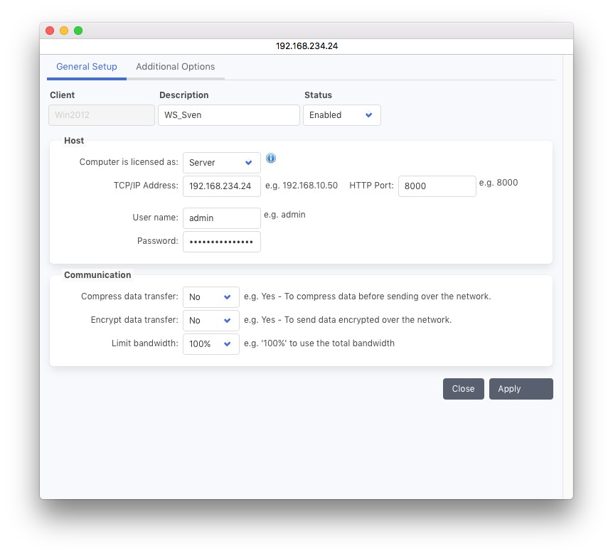 逆接続を許可する:はい: サーバーがこの接続を介して接続することを許可します。いいえ: 接続は使用されません。これは、Backup2Go ワークステーションで使用されます。