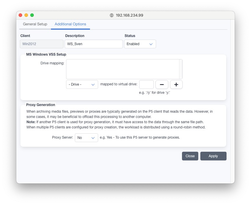 バージョン7.4から、P5はアーカイブ時のプレビュー生成にP5クライアントを1台または複数台プロキシとして使用することを可能にしました。プレビュー生成は通常、リソースを多く消費するため、NASのような弱いプロセッサを持つストレージからアーカイブする場合、高速なクライアントを使用してプレビューファイルを生成する方が適しているかもしれません。