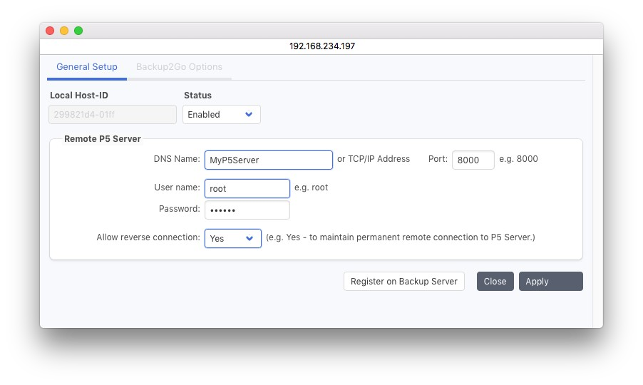 すべての値を入力したら、P5 サーバーに一度登録して、この場合はリバース接続が使用されることをサーバーに通知します。