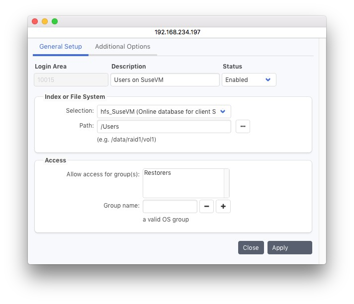 アーカイブまたはバックアップモジュールを選択し、拡張オプションのサブメニューから「ログインエリア」を選択してください。 - 下部のバーから「