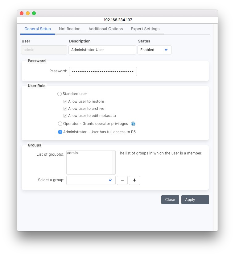 ユーザー設定は、ユーザー アカウント、アクセス パスワード、および P5 でのユーザーの役割を定義します。ここでは、たとえば「アーカイブ」などの特定の機能がユーザーに許可または拒否されます。ユーザーは最初に、一般ユーザーから設定を継承します。