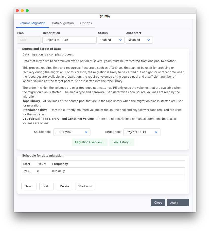 『P5 Archive DLM』(データライフサイクル管理)は、以前にP5 Archiveモジュールでアーカイブされたデータのライフサイクルを管理するための追加モジュールです。これにより、古いストレージから新しいストレージへデータを移行・複製するための移行計画や、テープ上の既存データが読み取り可能であるかを確認するための検証計画を提供します。P5 Archive DLMモジュールは、以前の「P5 Data Mover」の新しい名称であり、新しい検証機能も含まれています。