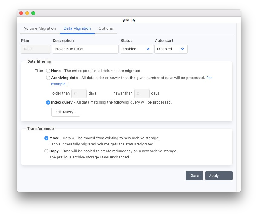 マイグレーションプランを使用すると、アーカイブされたデータを別のメディアに移行することができます。例えば、新しいテープ世代が使用される場合には、古いテープのデータを移行することが可能です。また、テープからクラウドやディスクへのデータ移動やコピー、またはその逆の操作も行えます。マイグレーション機能はアーカイブモジュールの左側メニューにあります。