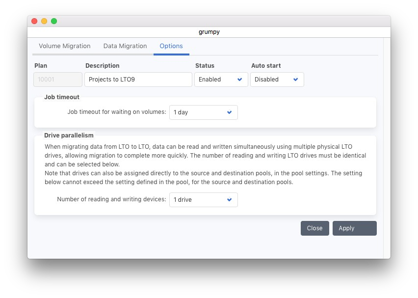 1つのテーププールから別のプールにデータを移行する際、複数のドライブを並行して使用することが可能です。各構成された並列ストリームにつき、読み込み用に1つ、書き込み用に1つのドライブ(クローン作成が有効な場合は2つのドライブ)が必要です。したがって、2つのドライブで並列処理を行う場合、少なくとも読み込み用に2つ、書き込み用にさらに2つのドライブが利用可能である必要があります。