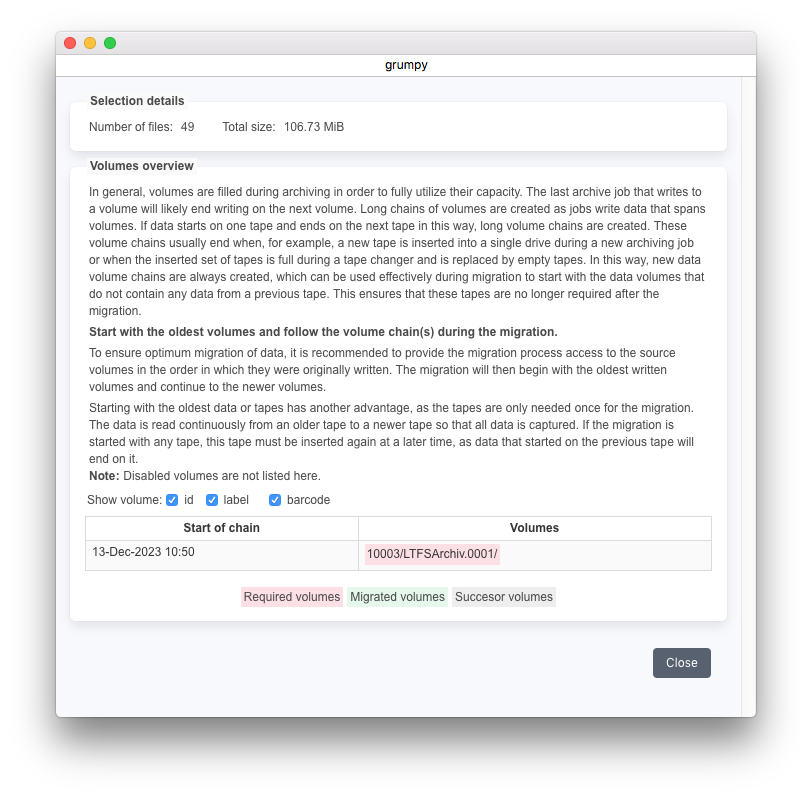 ファイルが複数のボリューム境界を超えて分割されている場合、それらを読み取り移行するには、最初に記録されたボリュームとその後続ボリュームの両方が必要です。このため、移行を計画する際は、1つまたは複数のボリュームチェーンをオンライン状態にすることで移行に適した状態にすることが合理的です。