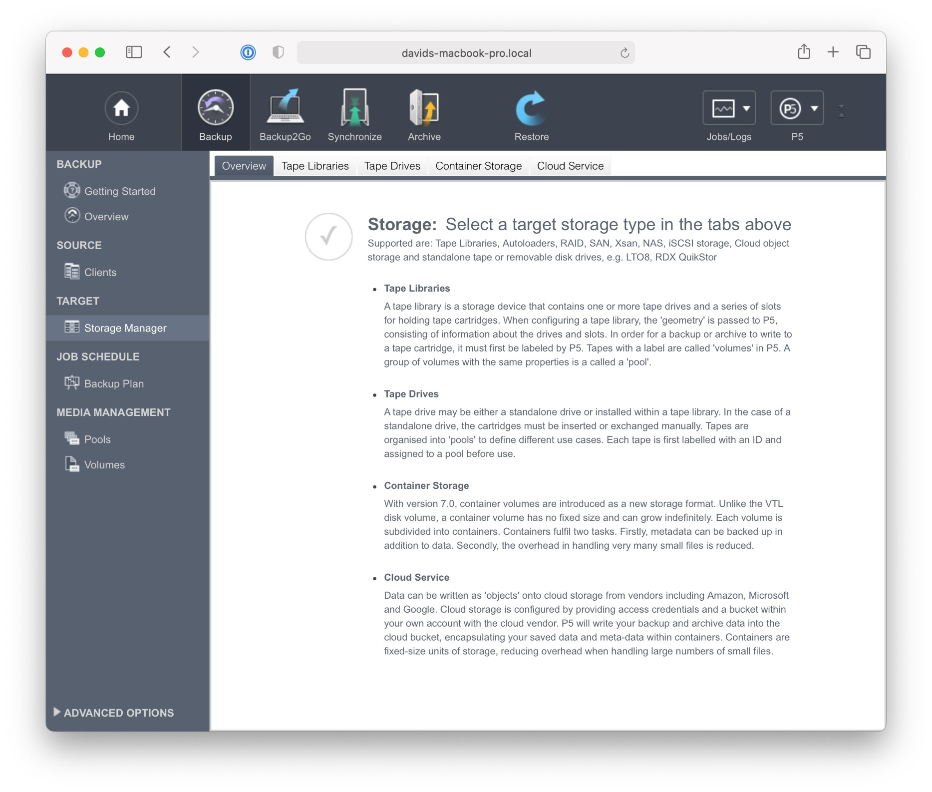 コンテナ ストレージを作成すると、P5 は書き込み先のドライブとして疑似デバイスを生成し、さらにメディア プール (セクション 6.3「ボリューム プール」を参照) を生成して、ストレージを P5 の既存のメカニズムに統合します。コンテナ ストレージは、1 つの P5 ボリュームと 1 つのメディア プールに対応します。