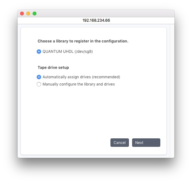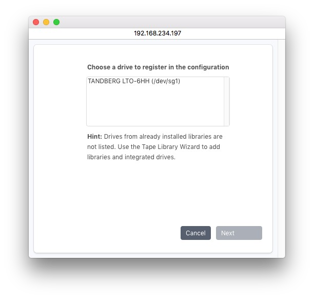 自動構成を開始するには、[新しいテープ ドライブ] をクリックし、[次へ] をクリックして確認します。