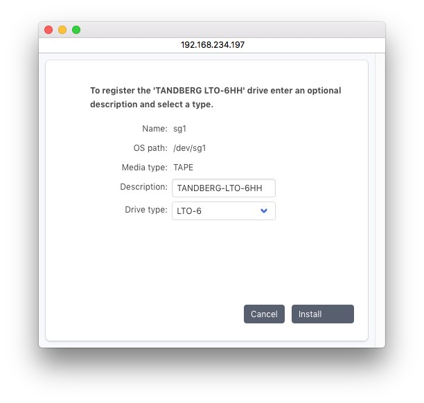 「説明」フィールドでは、このデバイスについてさらに説明することができます。プルダウン メニューから正しいドライブ タイプを選択し、「インストール」をクリックして入力内容を確認します。