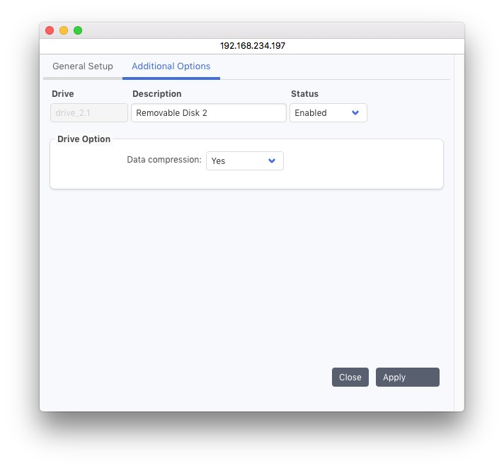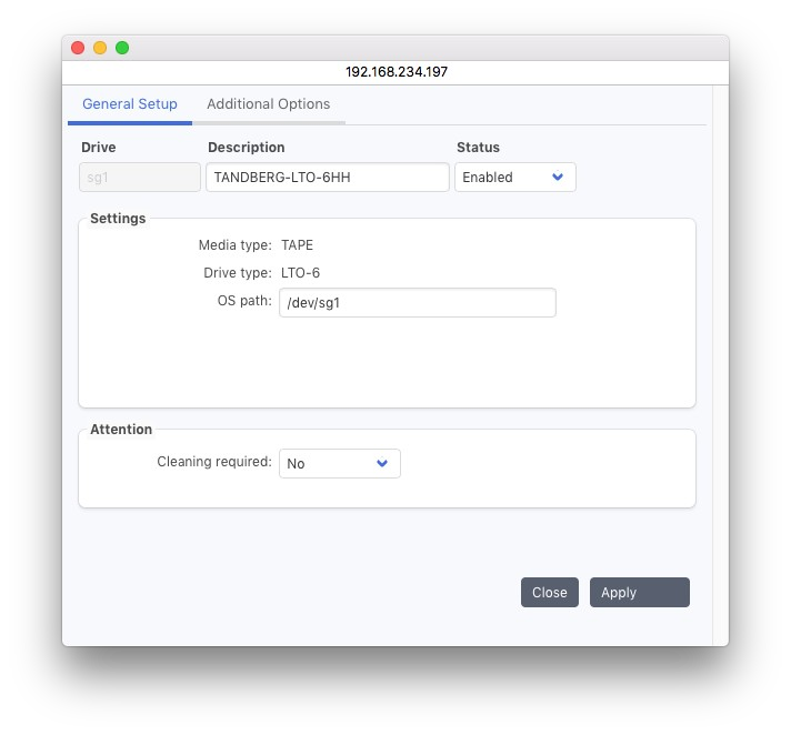 構成するデバイスのメディア タイプ。新しいドライブを定義するときに、サポートされているデバイスのポップアップ リストから選択できます。エントリが保存されると、このフィールドを変更できなくなります。変更したい場合は、新しいデバイスを定義する必要があります。テープ: データは AIT、DLT、LTO などのテープ上に保存されます。DISK: このタイプは互換性のために用意されており、使用しないでください。ディスク ストレージを設定するには、ストレージ マネージャーの仮想ジュークボックスの設定を参照してください。