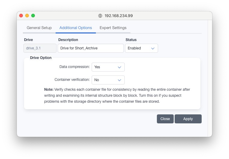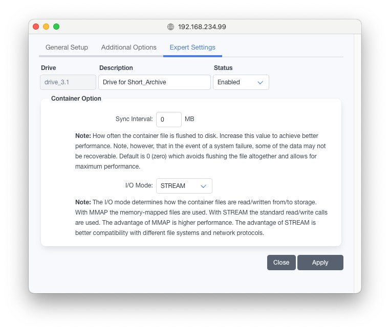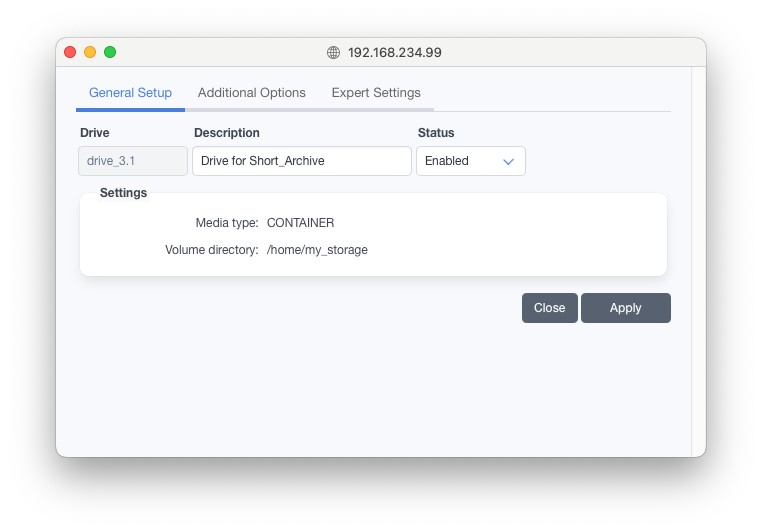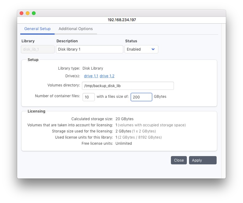 バーチャルテープライブラリは旧式なライブラリ方式ですので、新規プロジェクトではコンテナストレージの作成を推奨します。新しいインストールでは、バーチャルディスクライブラリは非表示に設定されています。有効にするには高度な設定を開き、gui.Jukebox.mediuaType.DISK.configurable.boolean を「1」に設定してください。詳細は6.16「詳細サーバー設定」を参照してください。