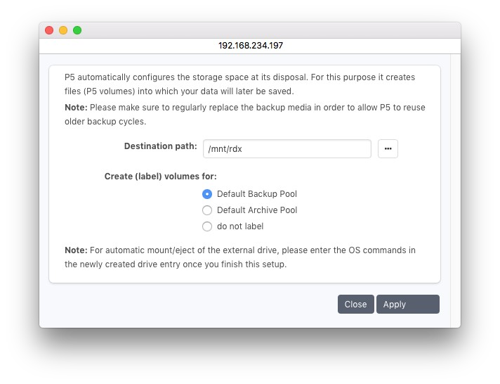 ウィザードでリムーバブルディスクを設定できます。ウィザードを使用すると、すべてのデバイス属性が自動的に検出されるウィザードを使用して設定することをお勧めします。ただしP5が目的のデバイスを自動的に認識しない場合はデバイスを手動で設定する必要があります。