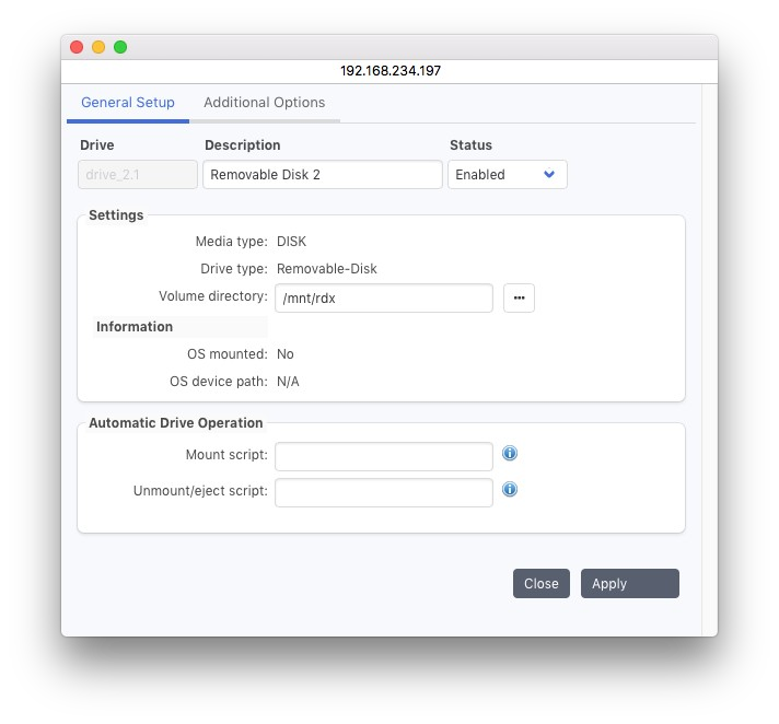 リムーバブル ディスクストレージはレガシーフォーマットであり、RDX ディスク カートリッジなどの交換が予定されている外付けハード ディスクの場合にのみ使用します。新規インストールでは、リムーバブル ディスク ストレージは表示されません。これを有効にするには、高度な設定を開き、gui.Device.deviceType.Removable.configurable.boolean を 1 に設定してください。詳細については、セクション 6.16「詳細サーバー設定」を参照してください。