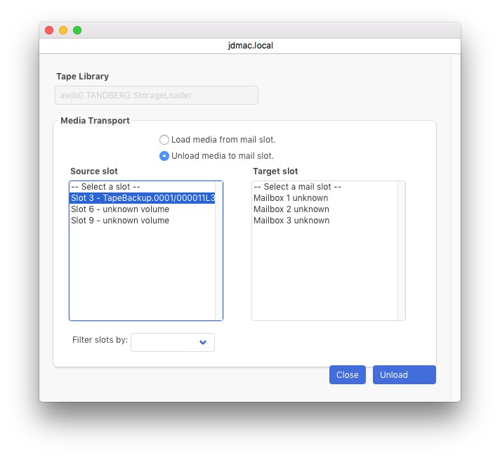 メディアをメールスロットにアンロードするソース スロット フィールドで選択されたメディアは、削除のためにメール スロットに転送されます。ボリューム データベースはそれに応じて更新されます。