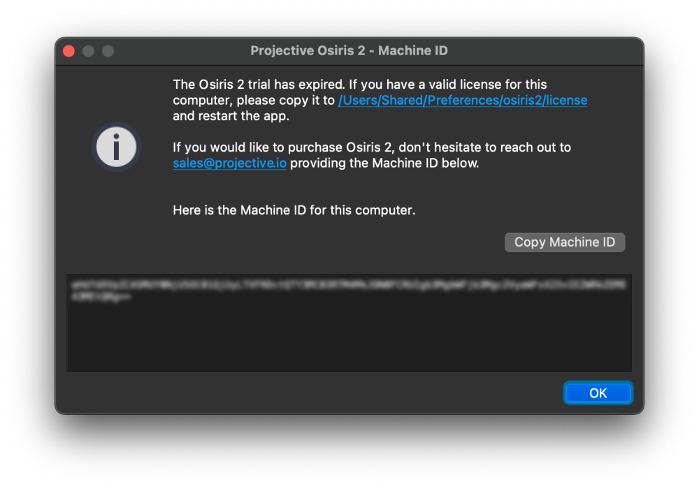 /Users/Shared/Preferences/osiris2/license。ライセンスを取得したシステムごとにこの手順を繰り返します。各ライセンス ファイルのファイル名には、それが属するコンピュータの名前が含まれています。 - 使用方法の章に進みます。