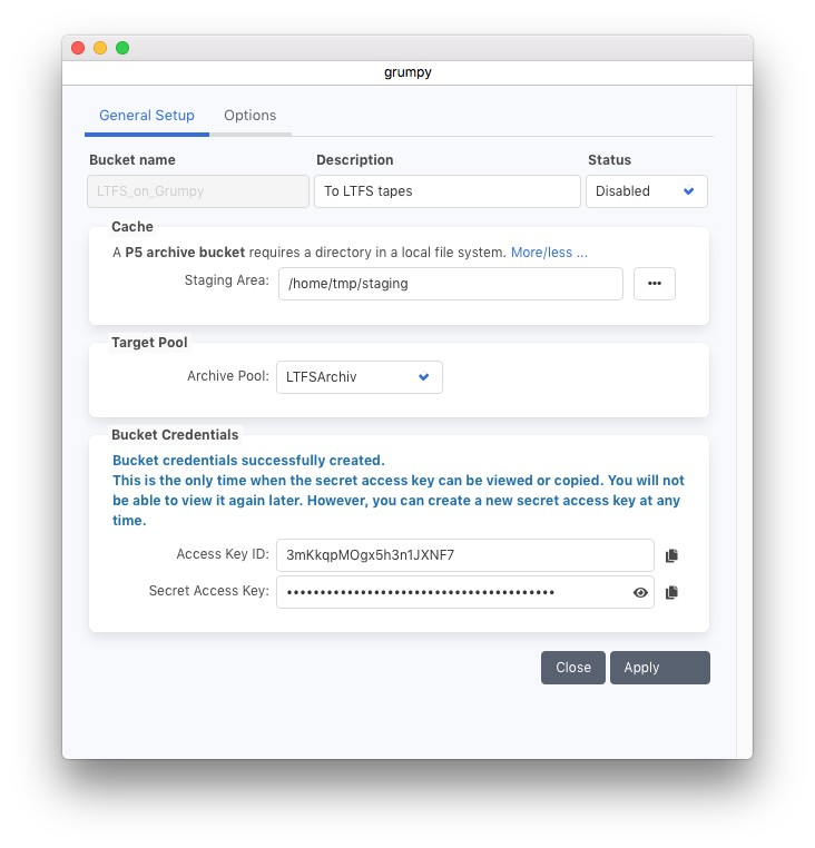 バージョン 6.1 以降では、アーカイブ用に LTFS (Linear Tape File System) テープを選択できます。LTFS テープにアーカイブするには、LTFS タイプのプールを作成し、そこにテープをラベル付けする必要があります。これらのテープは、LTFS 形式を除き、通常の P5 形式のアーカイブ テープと同じように扱われます。ただし、LTFS 形式で書き込まれたテープでは、テープ クローン機能はサポートされていません。LTFS テープはジョブを開始する前にラベル付けする必要があることに注意してください。後でジョブを中断してテープにラベル付けすることはできません。LTFS アーカイブの詳細については、セクション 6.5.3「LTFS テープへのアーカイブ」を参照してください。