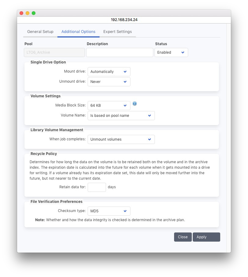 ラベル付け中に、ボリュームには物理テープを識別する一意の名前が付けられます。デフォルトでは、プール名と増分番号がボリューム名として使用されます。代わりに、このメニューでは、代わりにバーコード ラベルをボリューム名として選択できます。これにより、大きなテープ セットでバーコード ステッカーによるテープの識別が簡単になります。