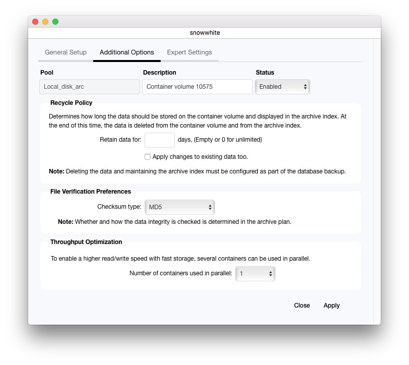 アーカイブされたデータの保持期間を変更することができます。デフォルトは 0 (無制限) です。これにより、アーカイブ コンテナー ストレージから古いデータを削除できます。チェック ボックスをオンにすると、変更された保持期間を既存のデータにも適用できます。