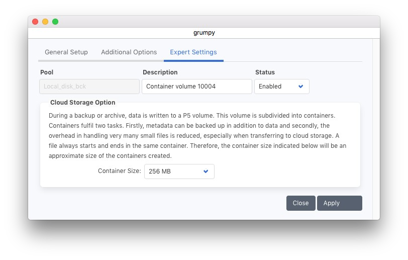 コンテナ ストレージでは、ファイルはコンテナに保存されます。コンテナには実際のファイルのほかにその属性も含まれます。ここでデータ コンテナのサイズを定義します。コンテナ サイズより小さいファイルは、バックアップまたはアーカイブ中に 1 つのコンテナに結合されます。ただし、大きいファイルは大きいコンテナに保存されます。