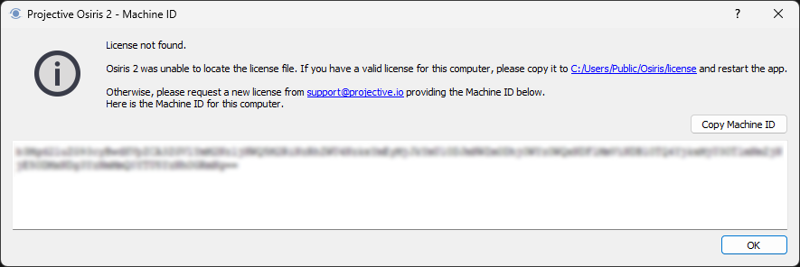 1. 起動時にOsiris 2は有効なライセンスの存在を確認します。有効なライセンスが存在しない場合は、次のメッセージが表示されます。