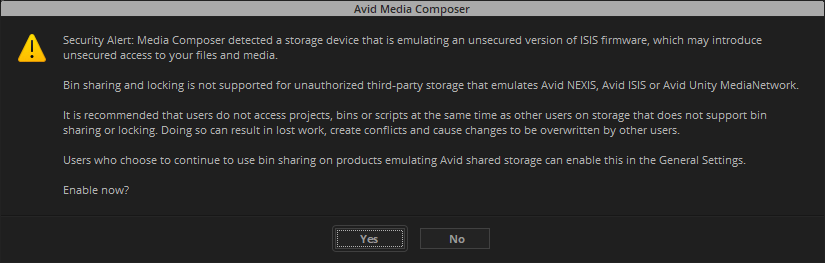 5. 次のメッセージが表示されます。不安に思えるかもしれませんが、これは単にサードパーティのビン ロックが正しく機能していることを Avid が確認したことを意味します。