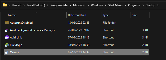 スタートアップ フォルダーに追加されると、すべての Windows ユーザーに対して Osiris 2 が自動起動します。