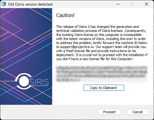 Cancel」ボタンをクリックしてインストールをキャンセルします。これにより、Osiris 2 の新しいライセンス ファイルを受け取るまで、レガシー Osiris を使用し続けることができます。 - レガシー Osiris を実行しているすべてのコンピュータに対して手順 1 ~ 5 を繰り返します。