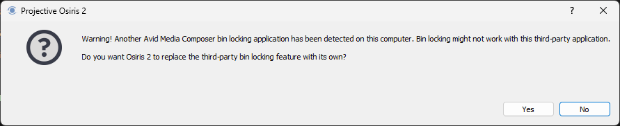 Yesをクリックすると、従来の Osiris のビン ロック メカニズムが新しいものに置き換えられます。既存のビンロック機能の置き換えに失敗した場合は、Osiris アプリを管理者として起動し、もう一度Yesをクリックします。次回以降のアプリの起動には管理者権限は必要ありません。