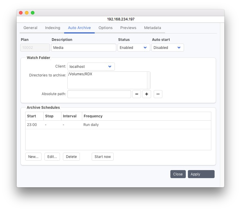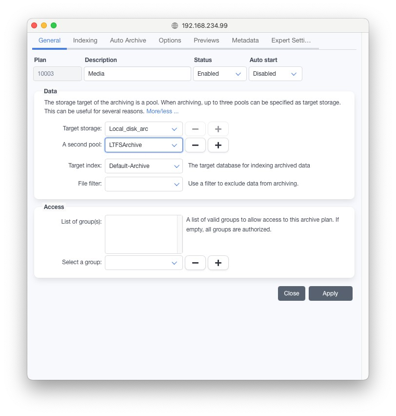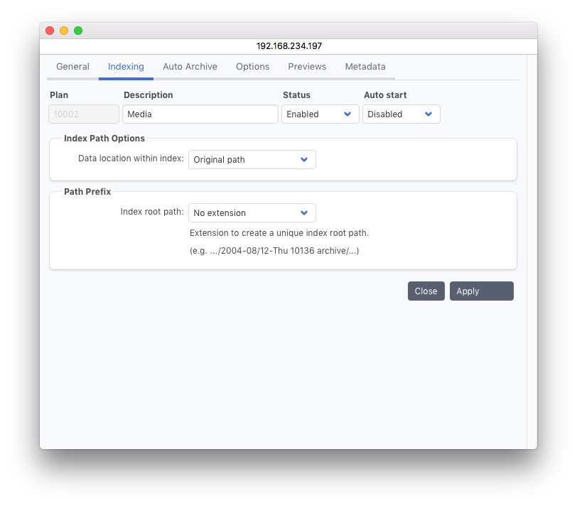 アーカイブプランの目的は、特定のアーカイブ操作の共通基準を保持することです。重要な2つのパラメーターは、データをアーカイブするターゲット「プール」と、ファイルリストを保持するターゲット「インデックス」です。