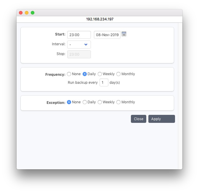 バックアップスキップはバックアップスケジュールと同じ方法で設定でき、特定の時間に実行を無効にすることができます。たとえば、その時点でドライブが他の目的に必要な場合などです。バックアップスキップを追加することで不可能なスケジュールを定義しないように注意する必要があります。