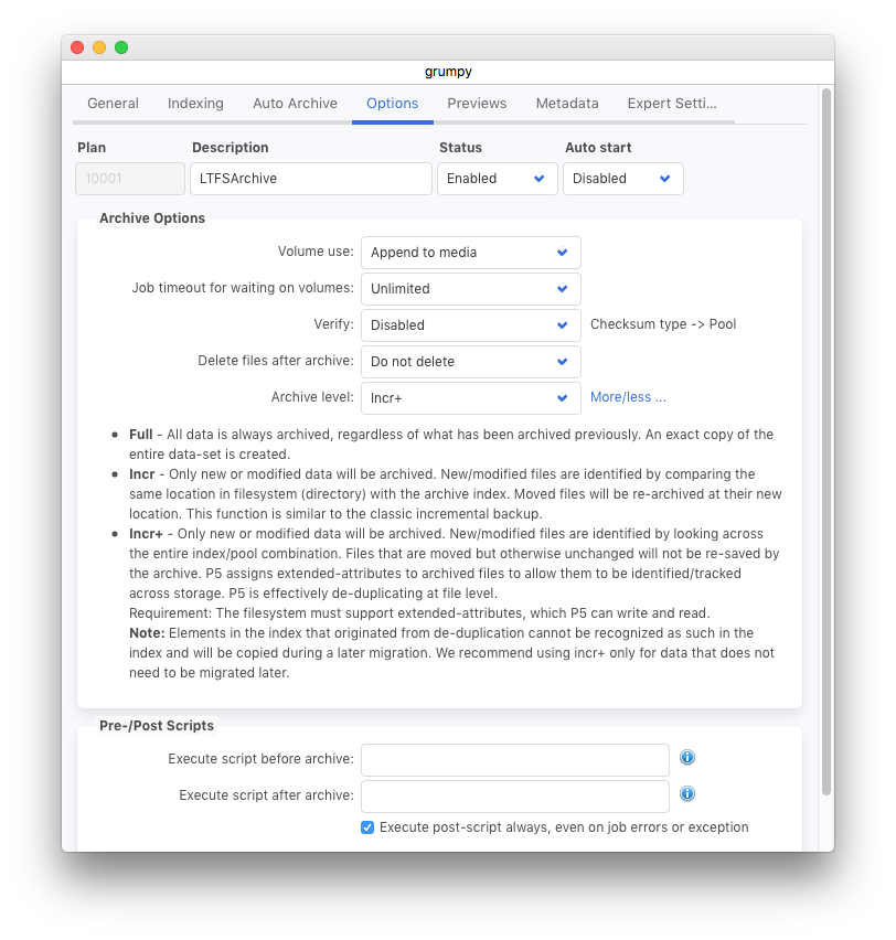 【注意!】ファイルが明示的に選択された場合、アーカイブ内に既に存在し、増分オプションが設定されていても、そのファイルは追加されることに注意してください。Incr+ が期待どおりに動作するには、データが存在するファイル システムが拡張属性をサポートしている必要があります。増分アーカイブを実行する場合、P5 はファイルをパスで比較します。