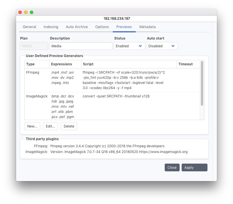 ImageMagick と FFmpeg はどちらも、プラグインを使用して複数のファイル形式とエンコードをサポートします。特定の形式がサポートされていない場合は、その形式に対応するプラグインがあるかどうかを確認してください。プラグインがない場合は、別のツールを使用して独自のプレビュー ジェネレーターを定義する必要がある場合があります。