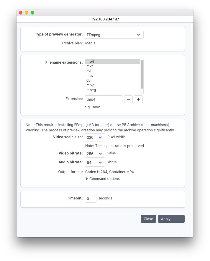 タイムアウト値は、単一ファイルのプレビュー生成に最大どのくらいの時間がかかるかを定義します。指定された時間が経過すると、P5 はコマンドの実行をキャンセルします。