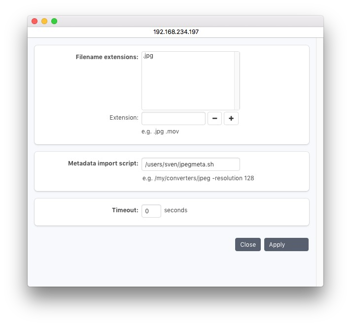 デフォルトのプレビュー コンバーターの代わりに、独自のコンバーター コマンドを構成することもできます。各コンバーター定義には、大文字と小文字を区別する拡張子のリストとコマンドを指定できます。リストされているファイル名拡張子のいずれかを持つファイルの場合、P5 はコンバーター コマンドを呼び出します。コンバーターは、変換する画像またはビデオの完全なファイル名をパラメーターとして受け入れる必要があります。生成されたプレビューの完全な名前 (パスを含む) を標準出力チャネル経由で返す必要があります。プレビュー ジェネレーターは、標準出力または標準エラー チャネルに他の出力を作成してはいけません。