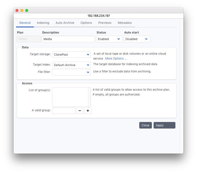アーカイブプランの目的は、定型のアーカイブ操作の共通条件を保持することです。アーカイブプランで重要な2つの要素は、データをアーカイブする先となるターゲット「プール」と、ファイルリストを保持するターゲット「インデックス」です。