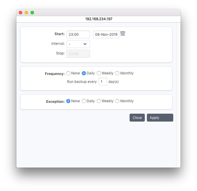例外は頻度と同じ方法で設定でき、特定の時間に実行を無効にすることができます。たとえば、その時点でドライブが他の目的に必要な場合などです。例外を追加することで不可能なスケジュールを定義しないように注意する必要があります。