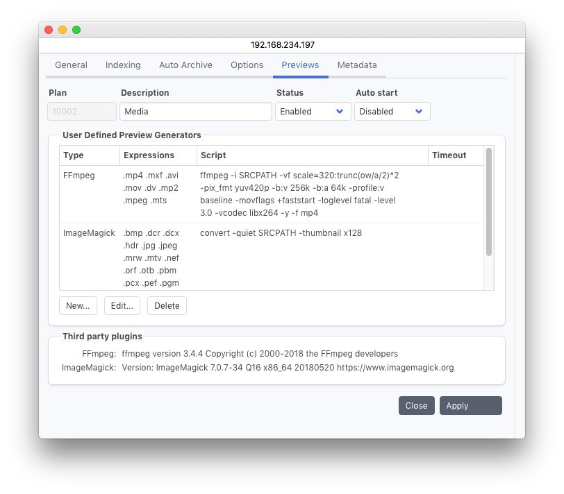 プレビューの生成は内部的には行われず、含まれていない外部ツールが必要です。静止画像の場合、ImageMagick へのインターフェイスが事前定義されており、動画形式の場合、FFmpeg へのインターフェイスが用意されています。
