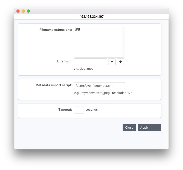 デフォルトのプレビュー コンバーターの代わりに、独自のコンバーター コマンドを構成することもできます。各コンバーター定義には、大文字と小文字を区別する拡張子のリストとコマンドを指定できます。リストされているファイル名拡張子のいずれかを持つファイルの場合、P5 はコンバーター コマンドを呼び出します。コンバーターは、変換する画像またはビデオの完全なファイル名をパラメーターとして受け入れる必要があります。生成されたプレビューの完全な名前 (パスを含む) を標準出力チャネル経由で返す必要があります。プレビュー ジェネレーターは、標準出力または標準エラー チャネルに他の出力を作成してはいけません。