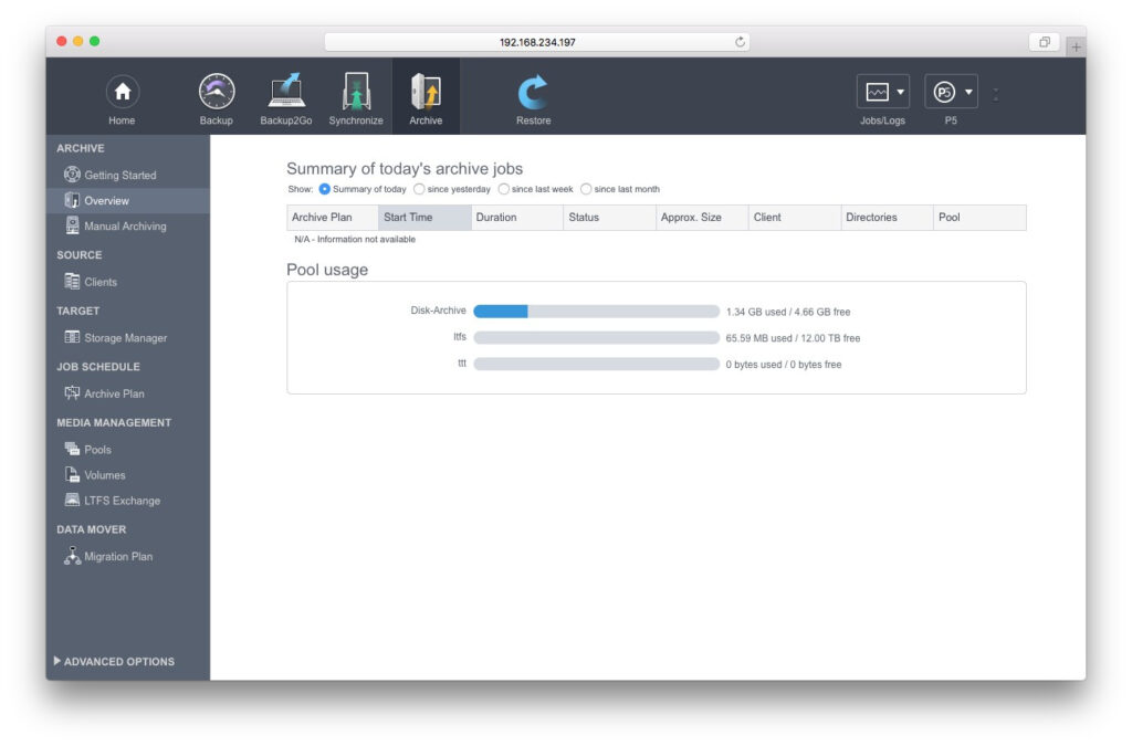 アーカイブの概要には、最新のアーカイブ ジョブの概要が表示されます。アーカイブされたフォルダーとともに、ステータスと期間が表示されます。