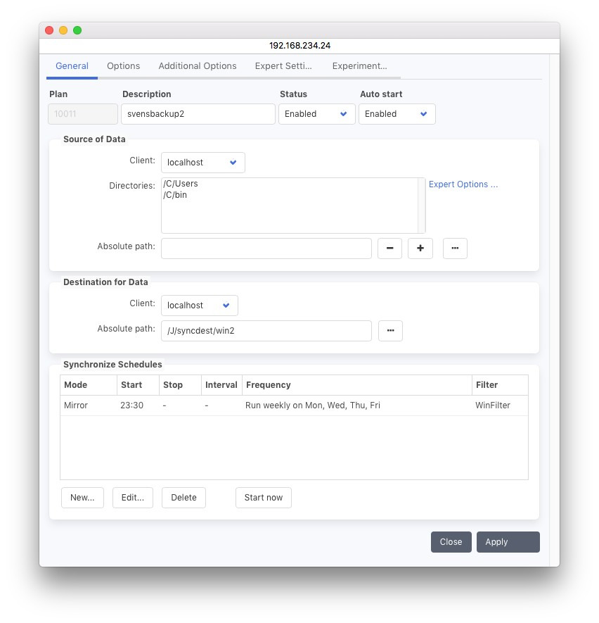更新: ターゲットからファイルは削除されません。新しいファイルと変更のみがコピーされます。このモードは以前は「増分シンクロナイズ」と呼ばれていました。増分バックアップに相当します。変更されたファイルのバージョンは維持できます。シンクロナイズプラン オプションは、保持されるバージョンの数を定義します。