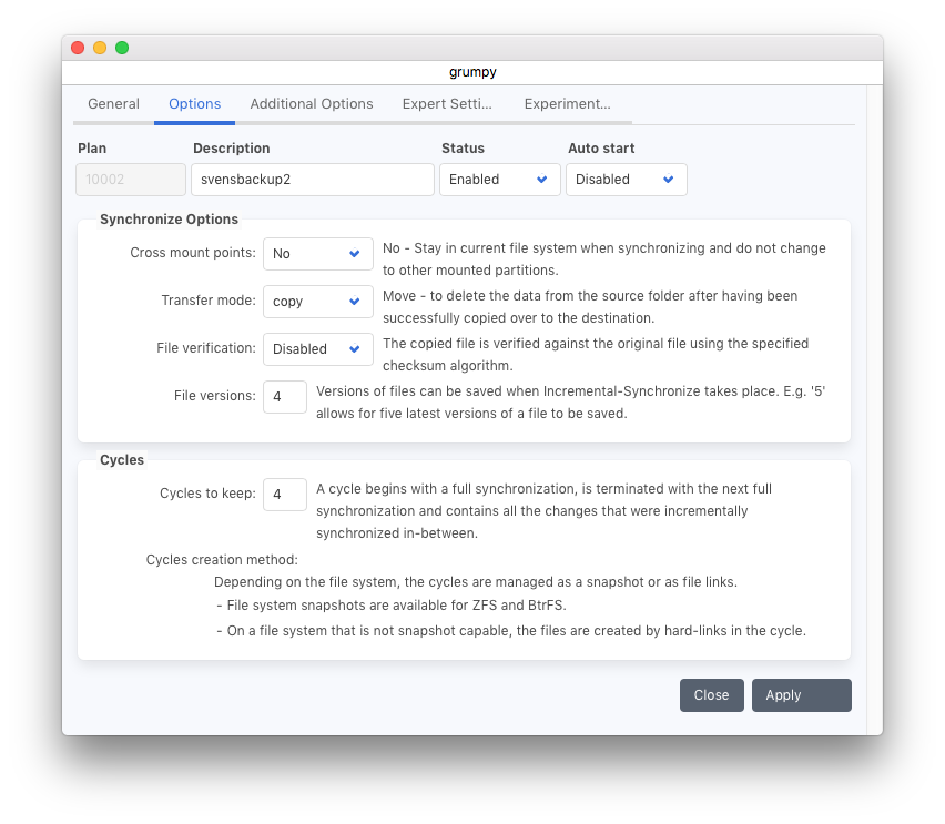 ミラー: ソースに存在しないターゲット上のファイルは、ターゲットから削除されます。シンクロナイズが完了すると、ソースとターゲットは同一のファイルを保持します。このモードは以前は「フルシンクロナイズ」と呼ばれていました。シンクロナイズをディスクへのバックアップとして使用する場合、このモードはフルバックアップに相当します。ミラー モードでは、ターゲットに既に存在するファイルは転送されません。ミラー モードでは、ターゲットの以前の状態をスナップショットに保存できます。シンクロナイズプラン オプションは、保持するスナップショットの数と、スナップショットの生成方法を定義します。