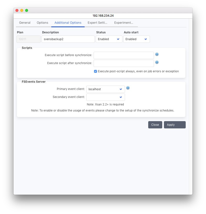 この設定はXSan 2.2 ファイルシステム専用の機能です。シンクロナイズプランのソースが Xsan 上にある場合、Macでのみ使用してください。Xsan は、メタデータ コントローラ MDC 上の fsevents をサポートします。ファイル システム イベントを使用するには、MDC に P5 クライアントをインストールし、シンクロナイズオプションで P5 クライアントの名前を設定する必要があります。ファイル システム イベントを使用するかどうかを選択できます。これらは、以下のシンクロナイズジョブ スケジュールで設定できます。